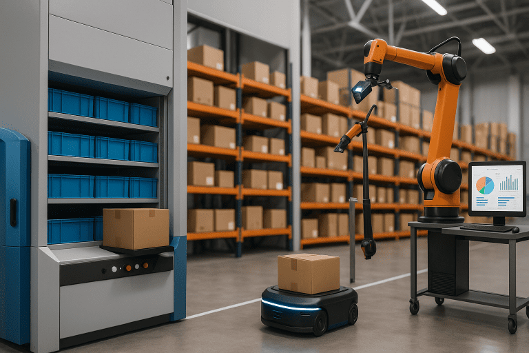 At the core of automatic distribution are automation tools like AS/RS systems, Vertical Lift Modules (VLMs), carousels, conveyors, sortation systems, AMRs, and warehouse robotics. These work alongside software platforms such as WMS, WES, and WCS to manage inventory, direct order fulfillment, monitor equipment, and orchestrate warehouse tasks in real time.